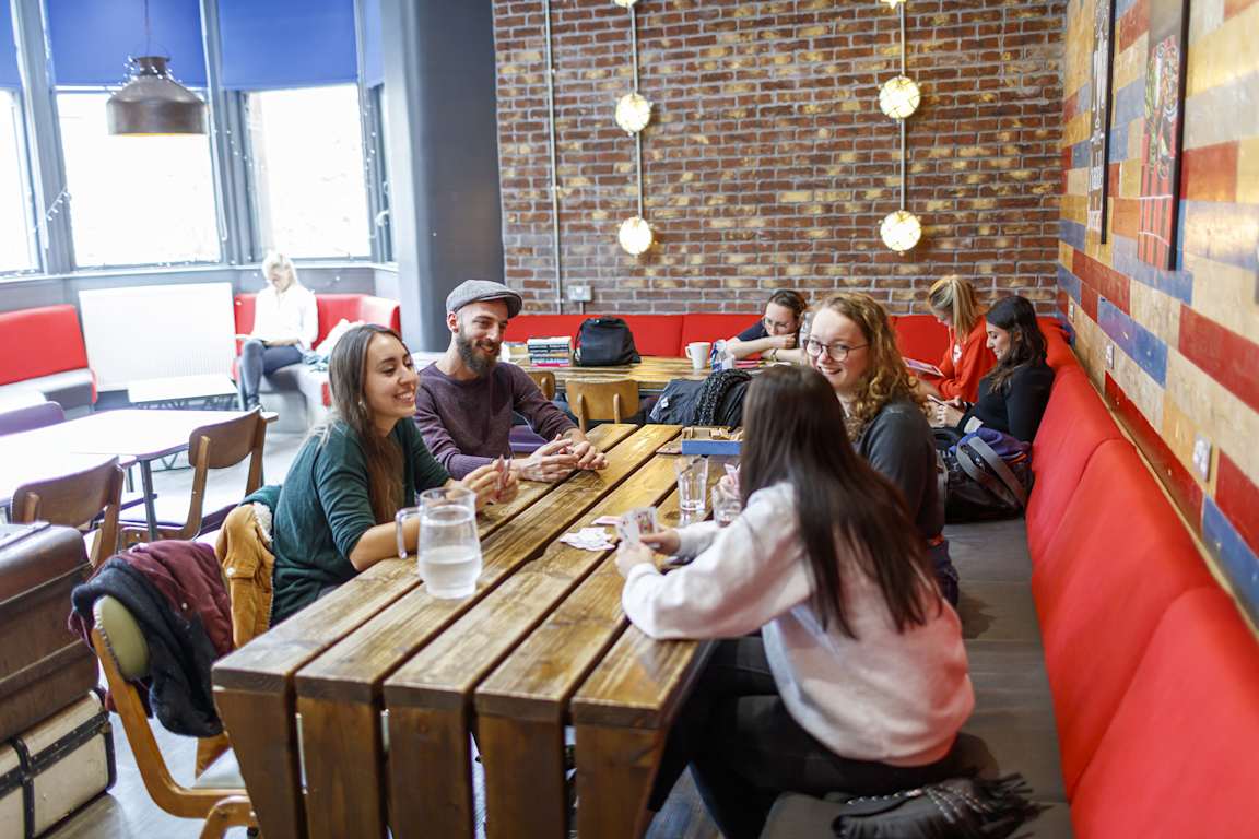 Harás nuevos amigos fácilmente en la cafetería y el bar con eventos sociales a diario. ¿Que tu presupuesto es limitado? Ve al bar de estilo industrial (con comidas desde unos 5 €) o prepárate un plato en nuestra cocina de autoservicio. Si tienes alguna duda, nuestro personal multilingüe te atenderá encantado en la recepción, abierta las 24 horas. Para que disfrutes al máximo, organizamos una noche de cine semanal en nuestra cómoda sala de estar.